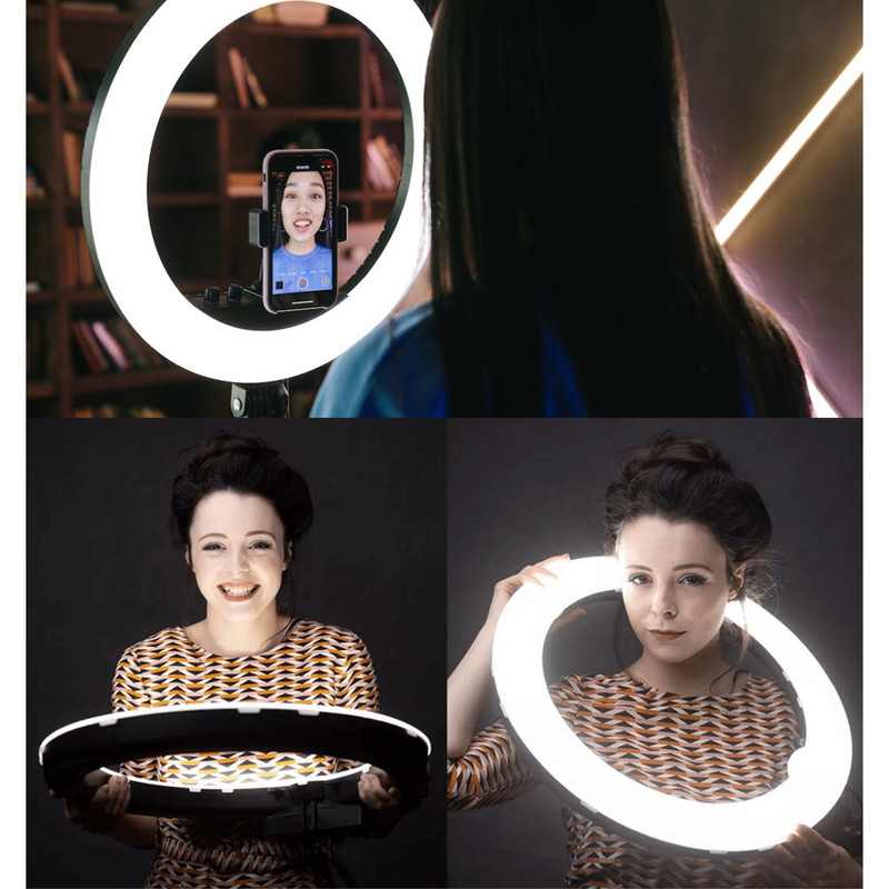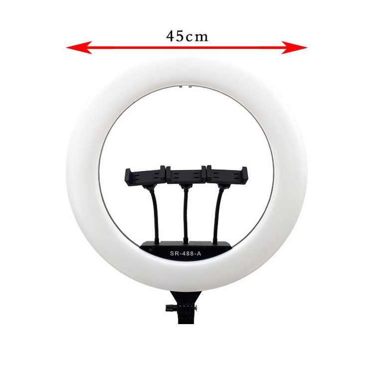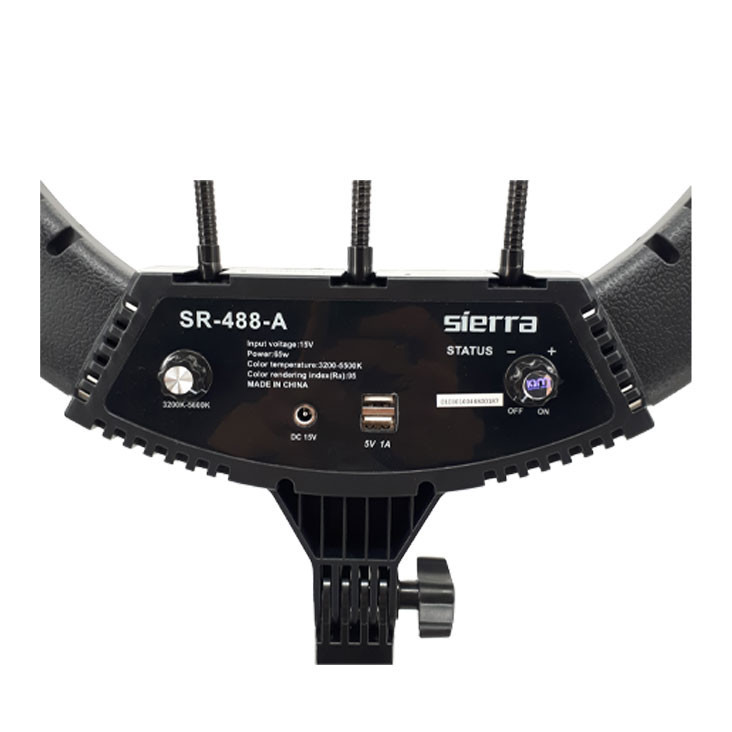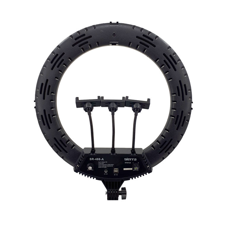 رینگ لایت Sierra-488، با قطر خارجی 45 سانتیمتر و توان 70 وات از جمله رینگ لایتهای باکیفیت برای عکاسی و تولید محتوا است. از مهمترین ویژگیهای رینگ لایت Sierra-488، وجود دیمر جهت تنظیم شدت و رنگ نور است. با استفاده از دیمر قدرت نور میتوانید میزان روشنایی رینگ لایت را تنظیم کنید. دمای رنگ رینگ لایت نیز بین 3200 تا 5500 کلوین قابل تنظیم است. امروزه بیشتر آرایشگرها و همچنین میکاپ آرتیستها از این رینگ لایت برای نشاندادن هنر خود استفاده میکنند. Sierra-488 برای عکاسی پرتره و مدلینگ، عکاسی تبلیغاتی، عکاسی از مدلها در سالنهای زیبایی و … مناسب است. جنس دیفیوزر به کار رفته در آن بسیار باکیفیت بوده و به همین دلیل یک نور نرم و یکنواخت را برای شما فراهم میآورد. از دیگر ویژگیهای این رینگ لایت، وجود آداپتور قدرتمند با خروجی 12ولت و جریان 5 آمپر است. بنابراین، نور رینگ لایت نسبت به رینگ لایت های مشابه سفیدتر و قویتر خواهد بود.یکی از مهمترین ویژگیهای رینگ لایت Sierra-488 امکان زاویه دهی به آن است. با تنظیم پیچی که در انتهای رینگ لایت قرار دارد، میتوانید بهراحتی به رینگ لایت خود زاویه دهید و کیفیت نورپردازی را بهبود بخشید. همراه این محصول یک آینه هم وجود دارد که این آینه برای افرادی که قصد آموزش خود آرایی و یا معرفی محصولات آرایشی دارند بسیار کاربردی است. این آینه به خصوص برای بیوتی بلاگرها ارزشمند است.یک سمت این آینه ساده(تخت) و طرف دیگر آن مقعر است.مهم ترین کاربرد این آینه ها عکاسی سلفی و خودآرایی است. یکی از ویژگی های مهم رینگ لایت Sierra 488، همراه داشتن سه پایه جمع شو درون خود کیف رینگ لایت است که به راحتی می توانید به همراه رینگ لایت آن را حمل کنید.حداکثر ارتفاع سه پایه 180 سانتی متر و در کمترین ارتفاع 70 سانتی متر است.اقلام: یک عدد سه پایه نور پرتابل / سه عدد نگهدارنده موبایل / آینه / ریموت کنترل / آداپتور / مانت اتصال به سه پایه و یک عدد کیف حمل
