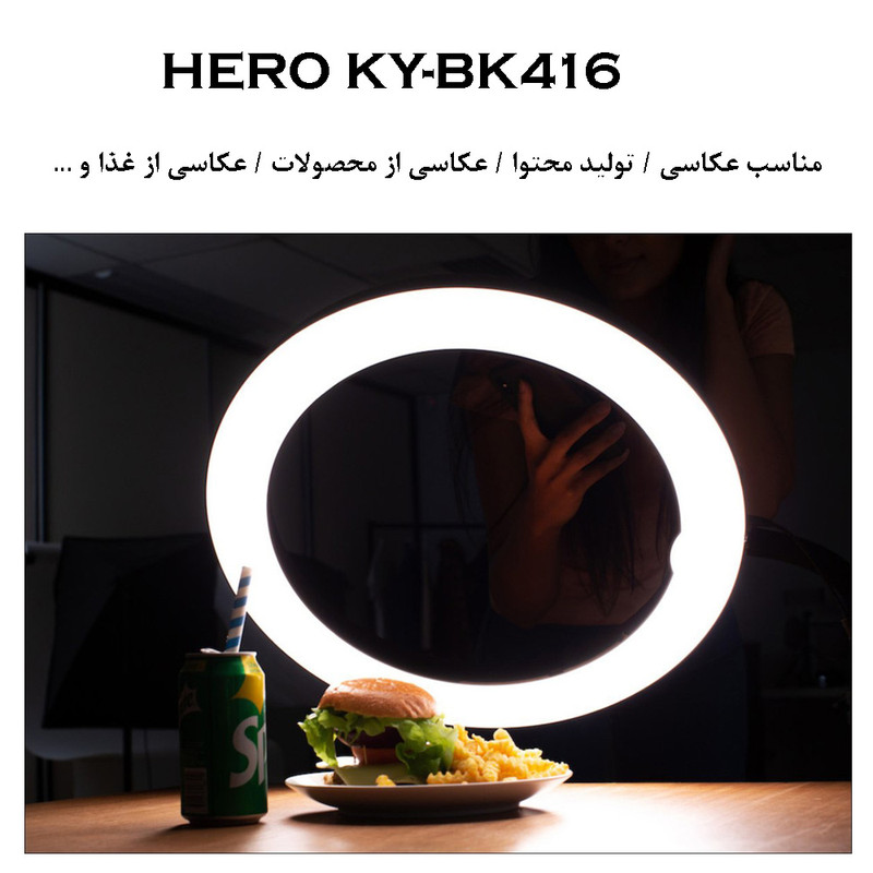 خرید رینگ لایت شاید این روزها طرفداران زیادی دارد اما انتخاب درست از بین مدلهای گوناگون بازار کار پیچیده ای است . رینگ لایت از برند Hero با قدرت خروجی 65 وات یکی از گزینه های حرفه ای برای شماست. رینگ لایت KY-BK416 با قطر 45 سانتی متر که بر روی آن پوشش نرم کننده نور و یا همان دیفیوزر وجود دارد تا بتوانید به بهترین شکل و بدون داشتن سایه های مزاحم عکاسی و یا فیلمبرداری کنید. رینگ لایت Hero با استفاده از پیچ تنظیم که بر روی آن قرار دارد قابلیت تنظیم زاویه را نیز دارد. مانت رینگ لایت مناسب نصب بر روی انواع سه پایه های نورپردازی است ( خرید سه پایه به صورت جداگانه امکان پذیر است ) . به همراه آداپتور که بر روی رینگ لایت قرار دارد می توانید با استفاده از برق شهری از آن استفاده کنید . نگهدارنده موبایل امکان چرخش و زاویه گیری را دارد و می توانید از آن برای تولید محتوا به صورت افقی و عمودی استفاده کنید. کیف موجود بر روی رینگ لایت BK416 این امکان را به شما می دهد که به راحتی آن را حمل کنید.بر روی صفحه پشتی رینگ لایت دو عدد دیمر جهت تنظیم نور و همچنین دمای رنگ وجود دارد . دمای رنگ رینگ لایت 3200 تا 5500 کلوین است ( رنگ آفتابی ، مهتابی و ترکیب هر دو ). در پشت رینگ لایت یک عدد پورت USB جهت شارژ موبایل نیز وجود دارد.مزیت این مدل نسبت به مدلهای مشابه داشتن سه عدد جای کلدشو بر روی رینگ لایت است که علاوه بر نگهدارنده موبایل می توانید انواع آینه ، میکروفون و ... که جای کلدشو دارند را بر روی این مدل نصب کنید.با استفاده از ریموت کنترل می توانید کلیه تنظیمات رینگ لایت را انجام دهید علاوه بر اینکه ریموت به شما این امکان را می دهد که از حالت جلوه های ویژه رینگ لایت مانند حالت چشمک زن ، حالت فلاش ، حالت کم و زیاد شدن و ... نیز استفاده کنید.