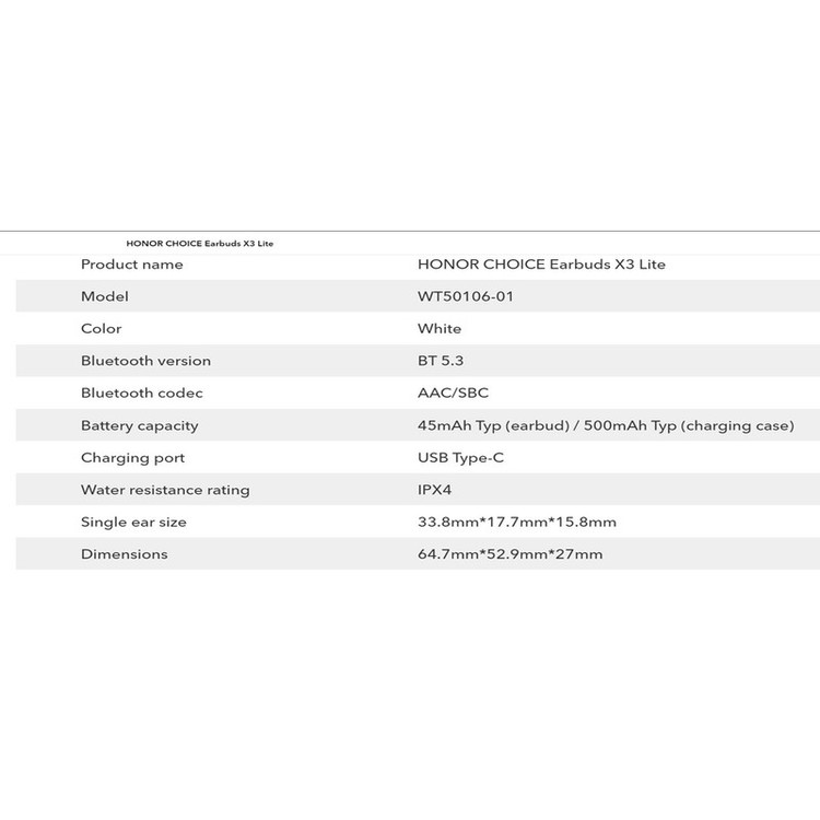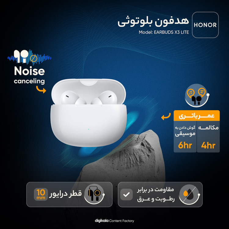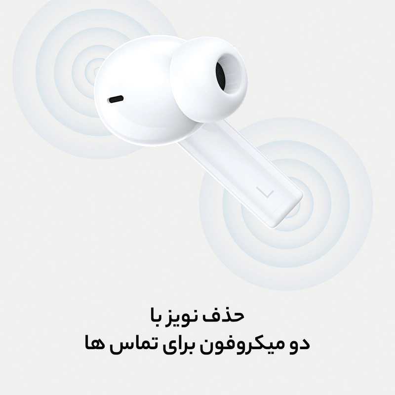 آنر از معدود برندهایی است که همیشه به طراحی ساده و مینیمال معتقد و پایبند بوده است و همواره آن را به بهترین نحو پیاده سازی میکند. هندزفری بلوتوث دوتایی آنر X3 Lite نیز از این قاعده مستثنی نیست و طراحی بسیار ساده و یکدستی دارد. HONOR CHOICE X3 Lite متشکل از دو هندزفری تو گوشی بی سیم و یک کیس شارژ نگهدارنده است. طراحی ایرفون های هندزفری آنر CHOICE X3 Lite به صورت In-Ear است که به شکل کامل درون گوش جای میگیرند و به محض اینکه آنها را درون گوش خود میگذارید، کم شدن نویز و صداهای اضافی محیط را متوجه میشوید. آنر برای اینکه تجربه شنیداری بسیار خوبی را در هنگام مکالمه به کاربران خود بدهد، از سیستم حذف نویز هوشمند در هندزفری خود استفاده کرده است. همچنین گوشیها هر کدام دارای 2 میکروفون نیز هستند که برای مکالمه، شناسایی و حذف نویز مورد استفاده قرار میگیرند. باتری ایربادز X3 Lite دارای ظرفیت 500mAh در کیس شارژ و 45mAh برای هر پنل است که سبب شده تا استفاده از آن در طولانی مدت نیز امکان پذیر باشد. به این ترتیب میتوانید تا حدودا 6 ساعت به موسیقی گوش دهید یا حدودا 4 ساعت مکالمه کنید. با در نظر گرفتن باتری کیس و خود گوشیها، شما امکان شنیدن موسیقی تا تقریبا 28 ساعت را خواهید داشت. نسخه بلوتوث به کار رفته در این هندزفری ورژن 5.3 است که به شما کمک میکند تا اتصال خیلی بهتری داشته باشید. اگر وسیلهای که با آن به هندزفری متصل میشوید نیز دارای نسخه 5.3 بلوتوث باشد، از مزایای مختلف و بیشتری نیز بهرهمند خواهید شد که به مواردی از آن اشاره خواهیم داشت. آنر X3 Lite از استاندارد IPX4 مقاومت آب نیز بهرهمند است که آن را برای استفاده در شرایط جوی بارانی نیز مساعد میسازد. همینطور میتوانید با خیال راحتتری به ورزش پرداخته و از بابت عرق کردن خود نگران نباشید، چراکه هندزفری در برابر عرق کردن نیز مقاومت دارد. توجه داشته باشید که استاندارد IPX4 به معنای ضد آب بودن هندزفری نیست، بلکه تنها مقاومت آن را در برابر رطوبت و آب بیشتر خواهد کرد.